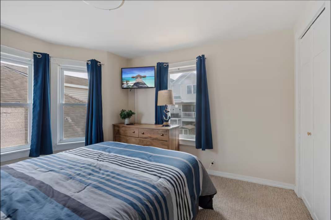 Primary Bedroom: Queen bed upstairs, cozy and bright with blackout curtains and TV.