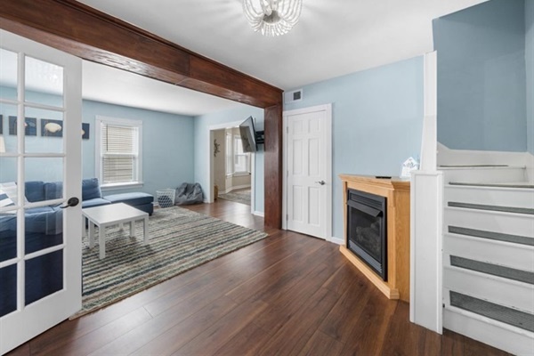 A bright, beach-inspired kitchen awaits — with all essentials from coffee maker to cookware. Enjoy family meals at the large dining table or unwind in the inviting living room, featuring a plush sectional, smart TV, games, and cozy fireplace. A dedicated workspace makes this home ideal for longer stays or remote work.