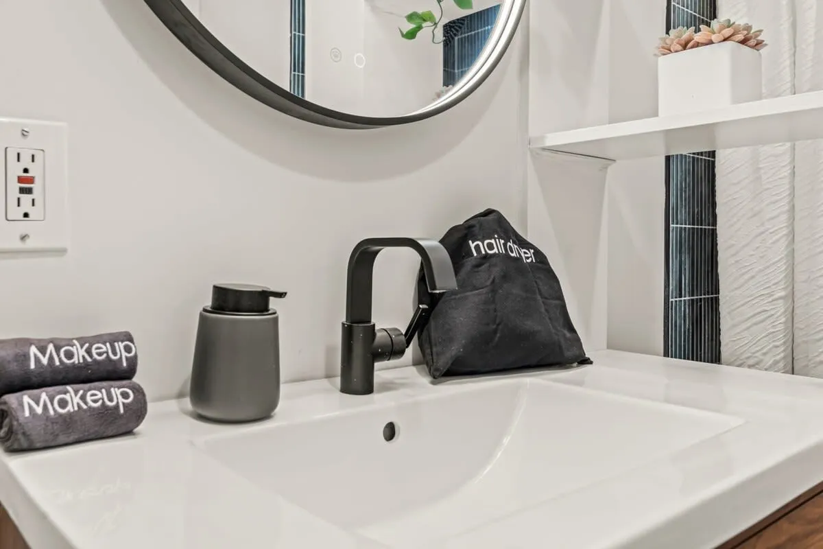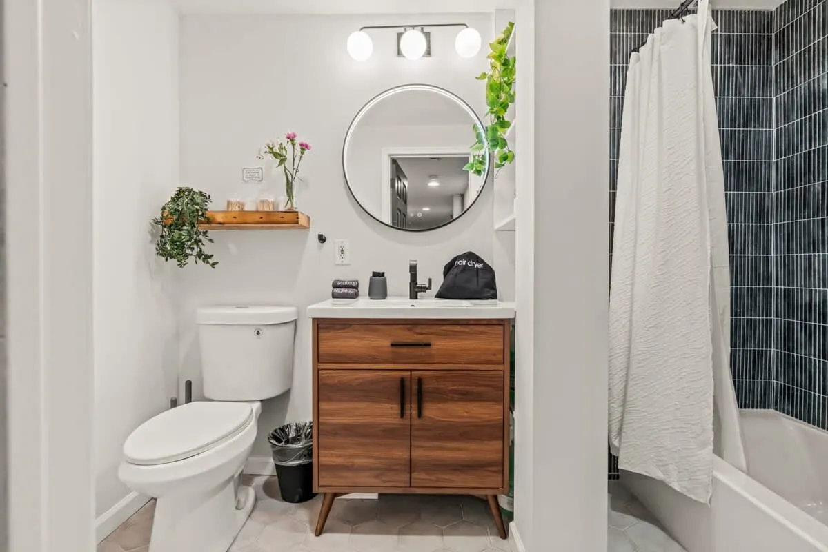 ☆☆ The beautifully updated full bathroom features a stylish tile shower with tub, warm lighting, and a mid-century vanity. It’s fully stocked with shampoo, conditioner, body wash, plush towels, and essentials—everything you need for a refreshing start or relaxing soak after a day exploring Philly.