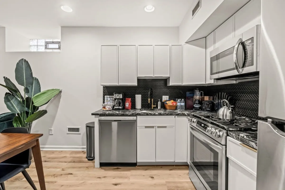 ☆☆ Enjoy cooking in the sleek kitchen with white cabinetry, black marble-style countertops, and stainless steel appliances. Fully stocked with cookware, bakeware, coffee, a blender, and all essentials. The open living and dining area invites connection—gather around the table for meals, unwind on the sectional, or stream your favorite shows by the electric fireplace.