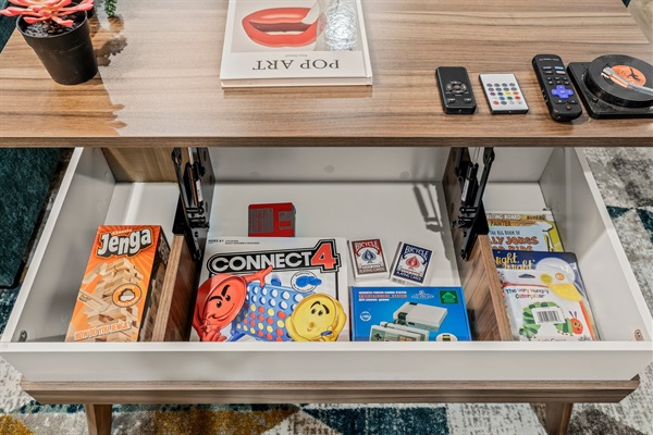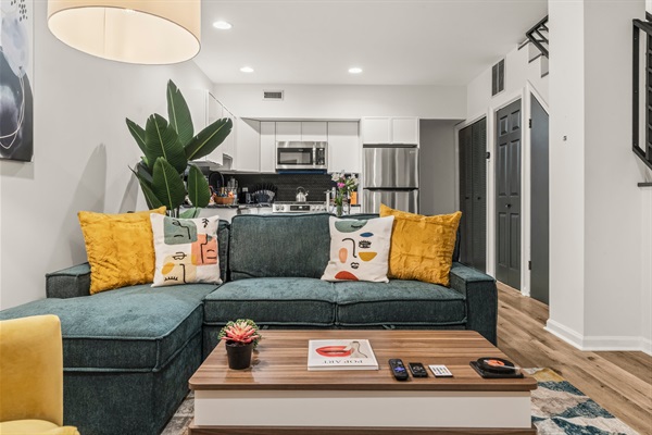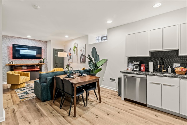 Enjoy cooking in the sleek kitchen with white cabinetry, black marble-style countertops, and stainless steel appliances. Fully stocked with cookware, bakeware, coffee, blender, and all essentials. The open living and dining area invites connection—gather around the table for meals, unwind on the sectional, or stream your favorite shows by the electric fireplace.