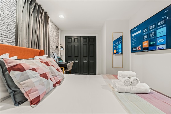 Relax in two bright, modern bedrooms featuring bold accent walls, plush memory foam mattresses, and thoughtful touches. Bedroom 1: Queen bed, workspace, and full closet. Bedroom 2: Queen bed with cheerful décor and cozy seating nook. Both rooms share easy access to the full bathroom and include Smart TVs, blackout curtains, and crisp linens for a restful stay.