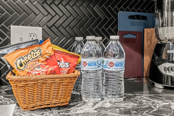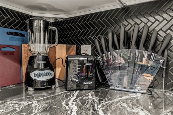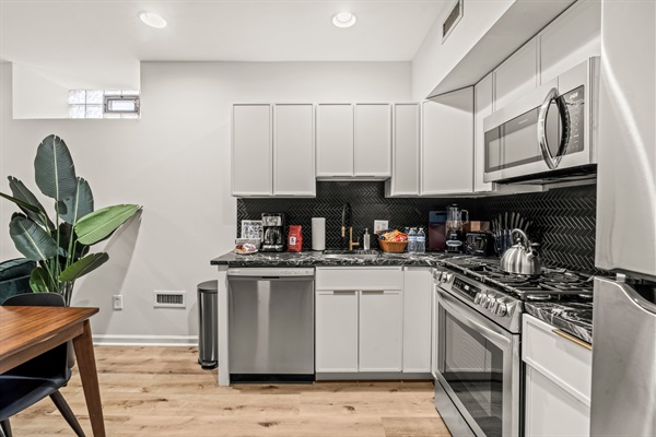 Enjoy cooking in the sleek kitchen with white cabinetry, black marble-style countertops, and stainless steel appliances. Fully stocked with cookware, bakeware, coffee, blender, and all essentials.
