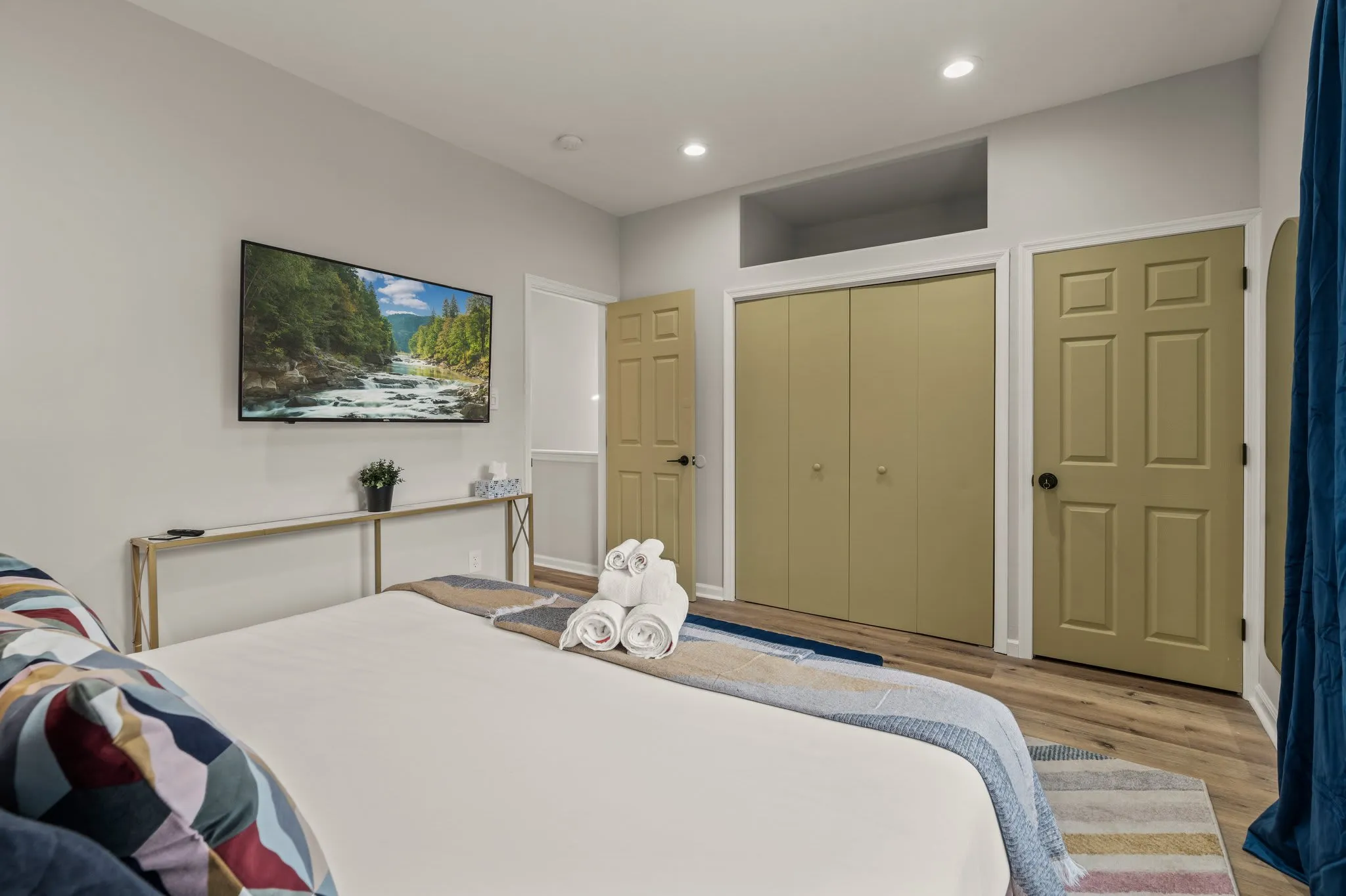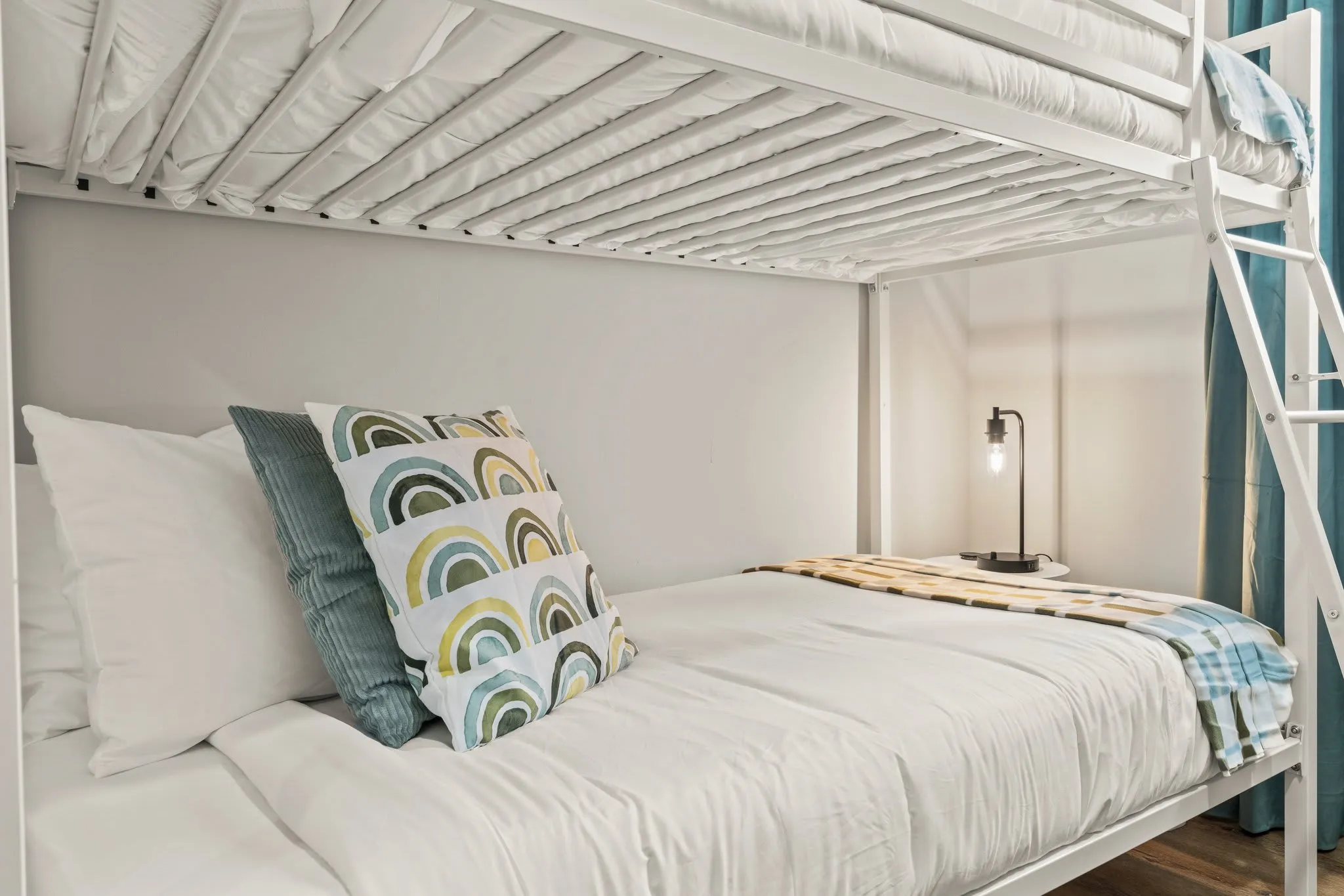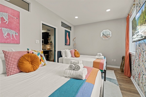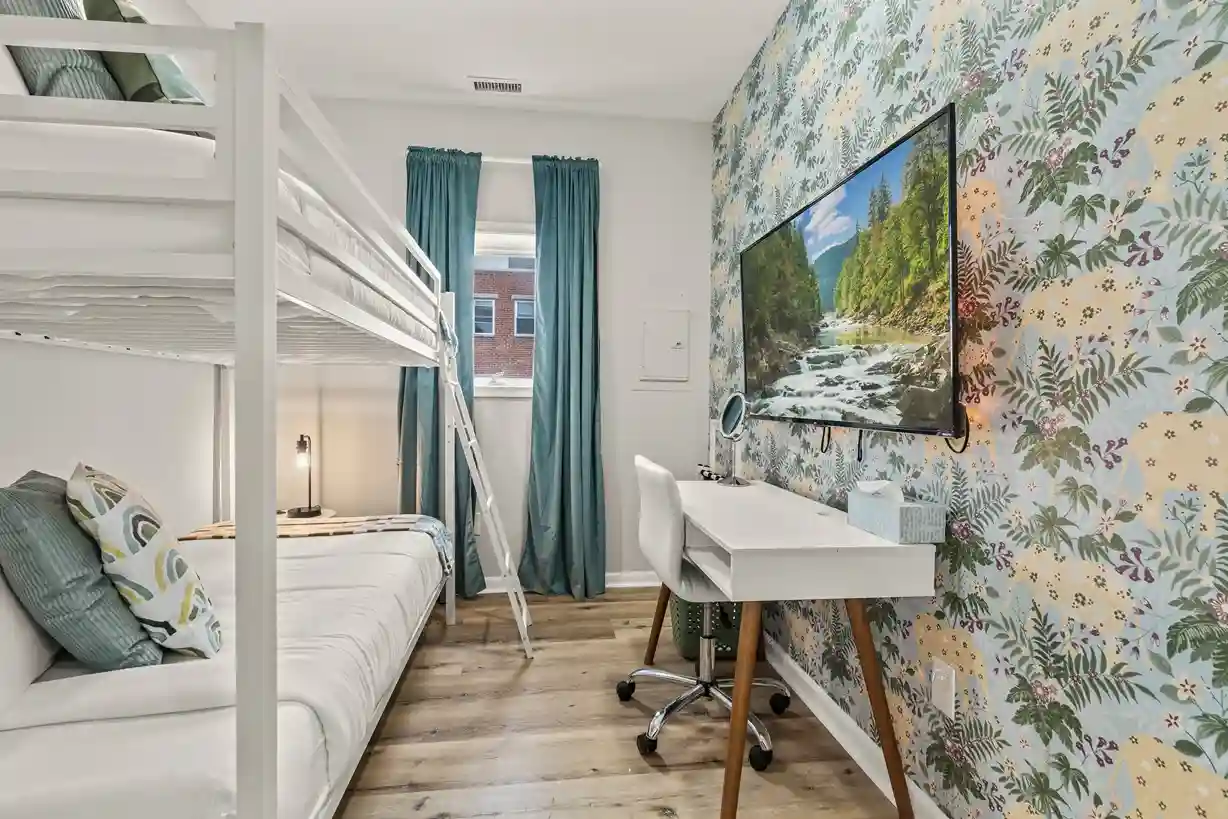 ☆☆ Three distinct bedrooms, each designed with comfort and style in mind: Rear Bedroom: King bed with premium linens and Smart TV — a quiet haven for restful nights. Front Bedroom: Two queen beds with vibrant décor, ideal for families or groups. Middle Bedroom: Bunk bed (twin over full) and a desk setup, perfect for kids or remote work. All bedrooms are on the same level, offering easy access and cozy, well-lit spaces that feel instantly welcoming.