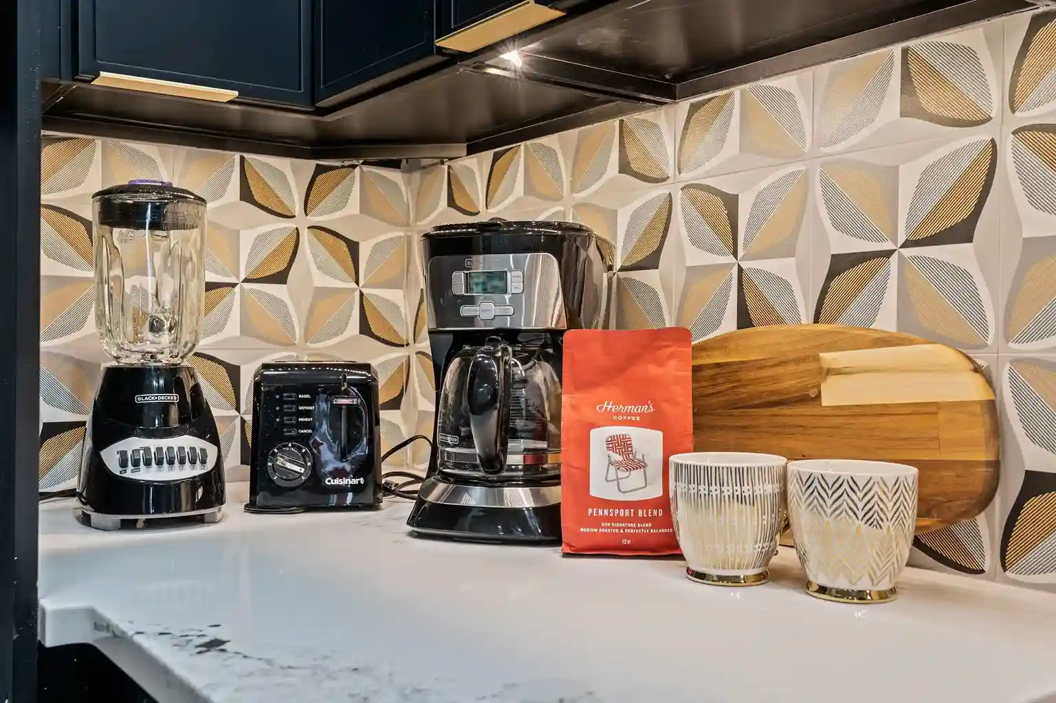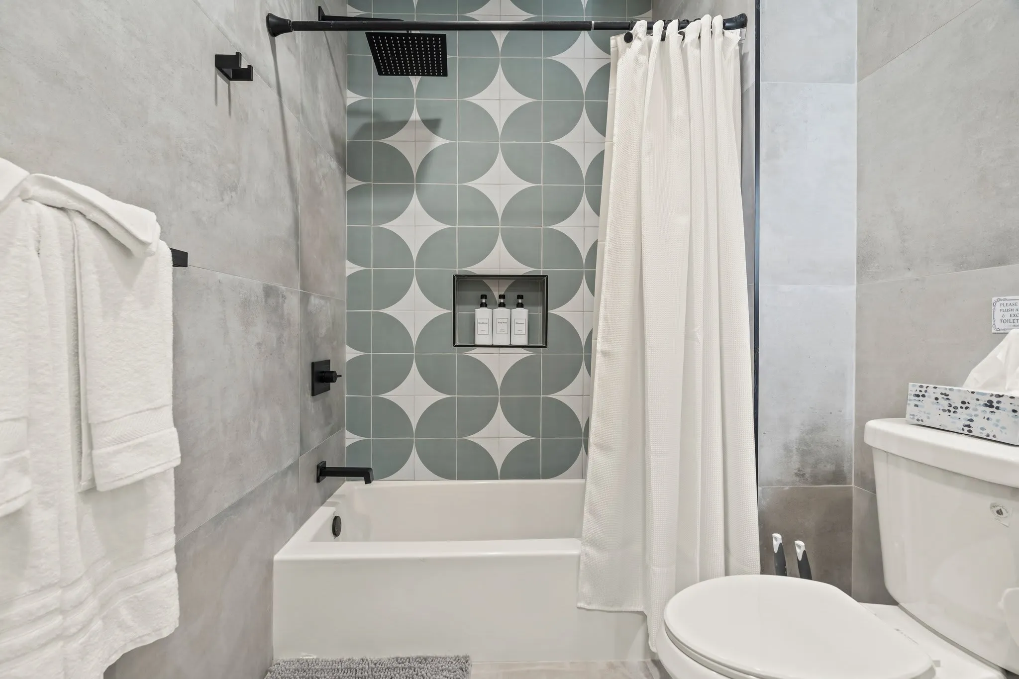 ☆☆ The full bathroom features a chic, modern design with a relaxing shower/tub combo and geometric tile surround. Thoughtfully stocked with body wash, shampoo, conditioner, plush towels, and all your daily essentials. Sleek fixtures and warm lighting create a spa-like feel that refreshes and recharges.