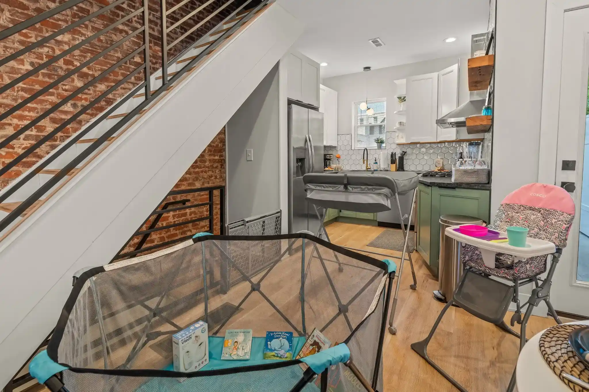 ☆☆ Whip up meals in the fully equipped kitchen, featuring quartz counters, stainless steel gas range, dishwasher, microwave, blender, coffee maker, and cookware. The living room boasts exposed brick walls, a 65" Smart TV, and comfortable seating. Enjoy meals at the round dining table, or head downstairs to the basement game room for family fun.