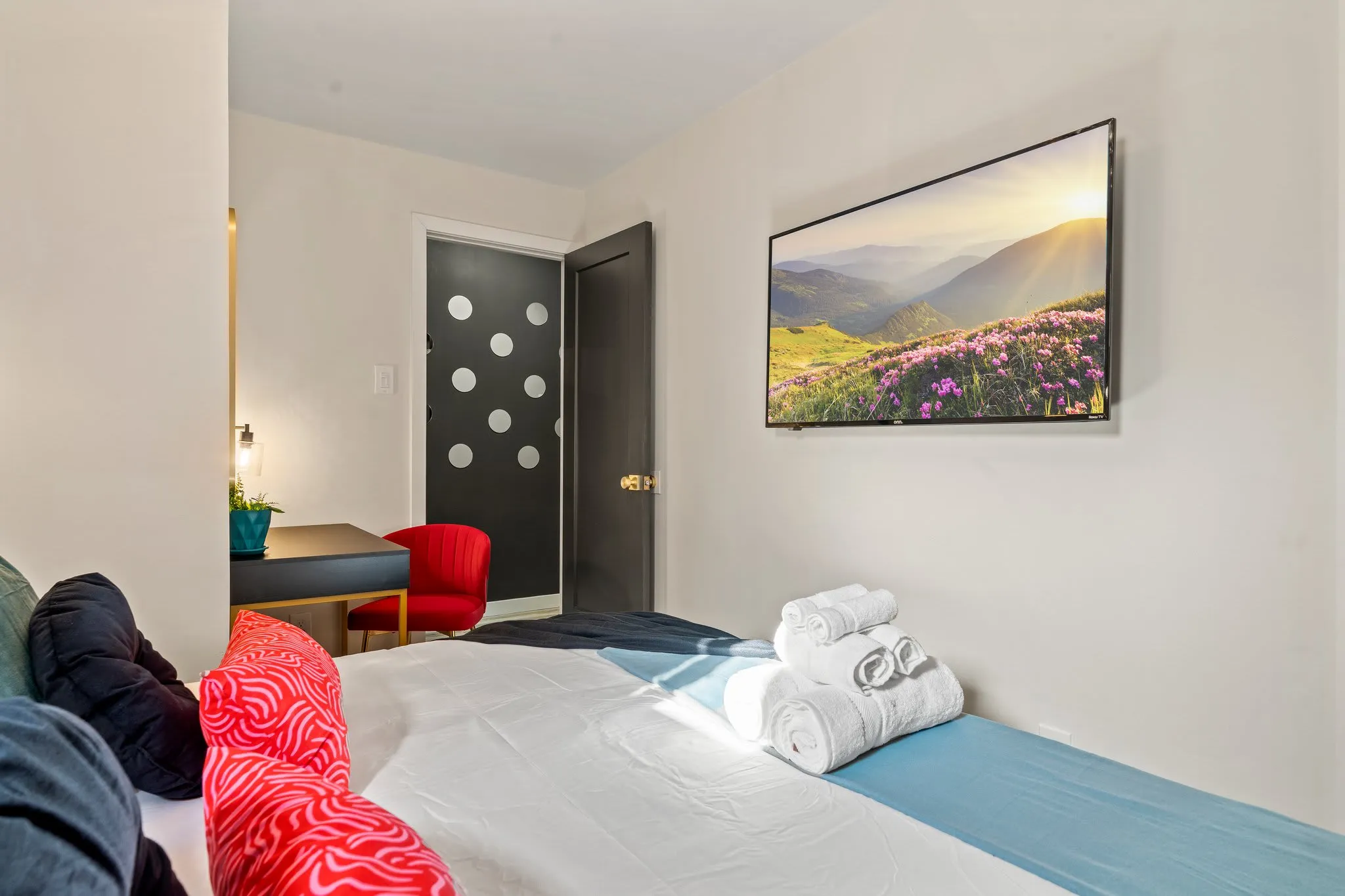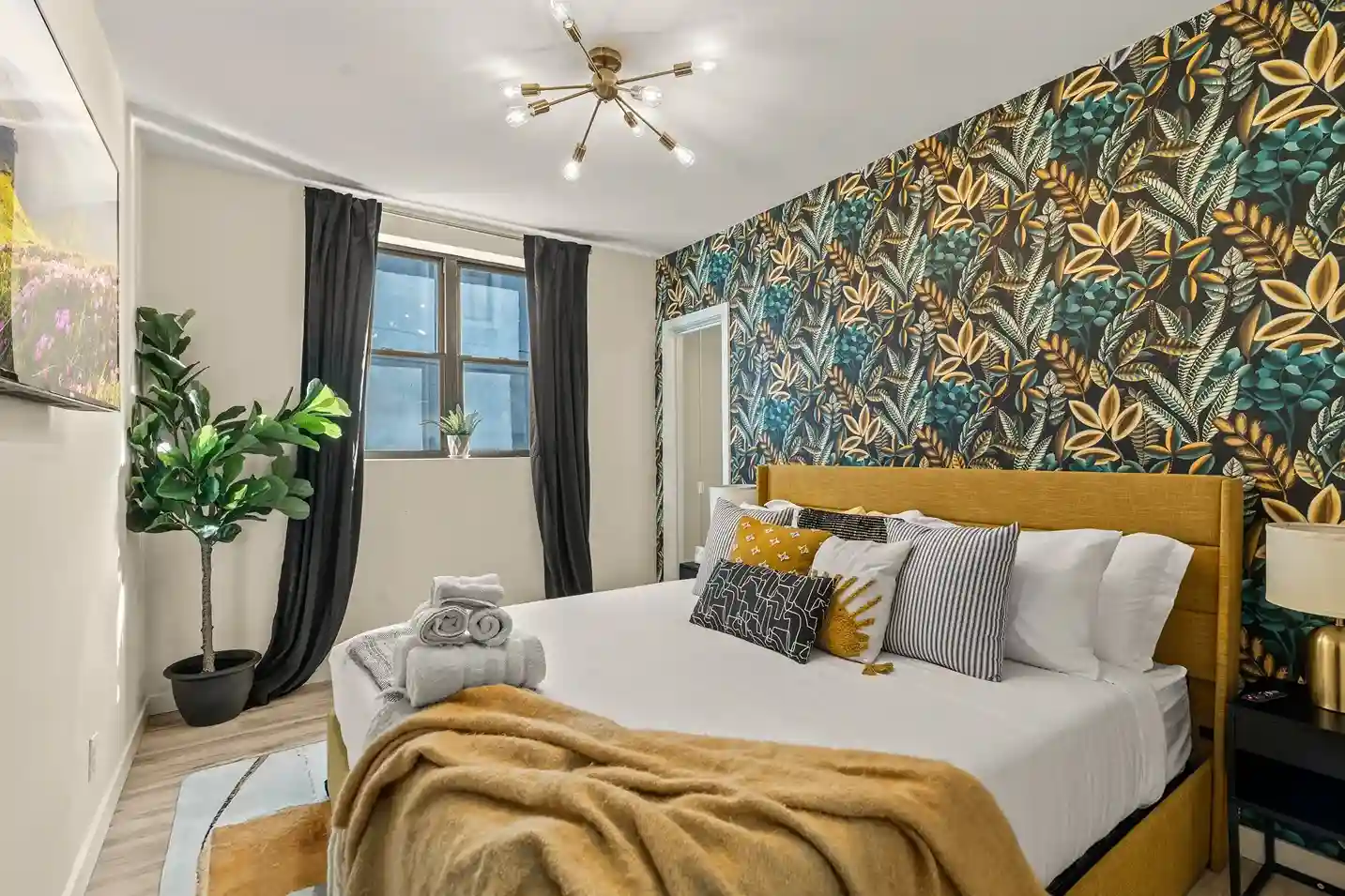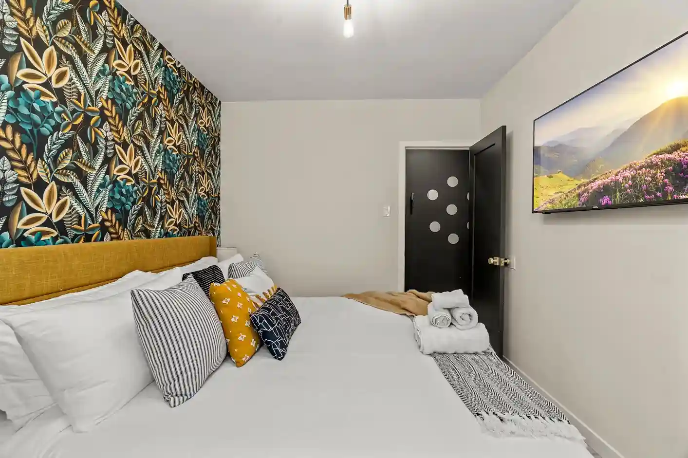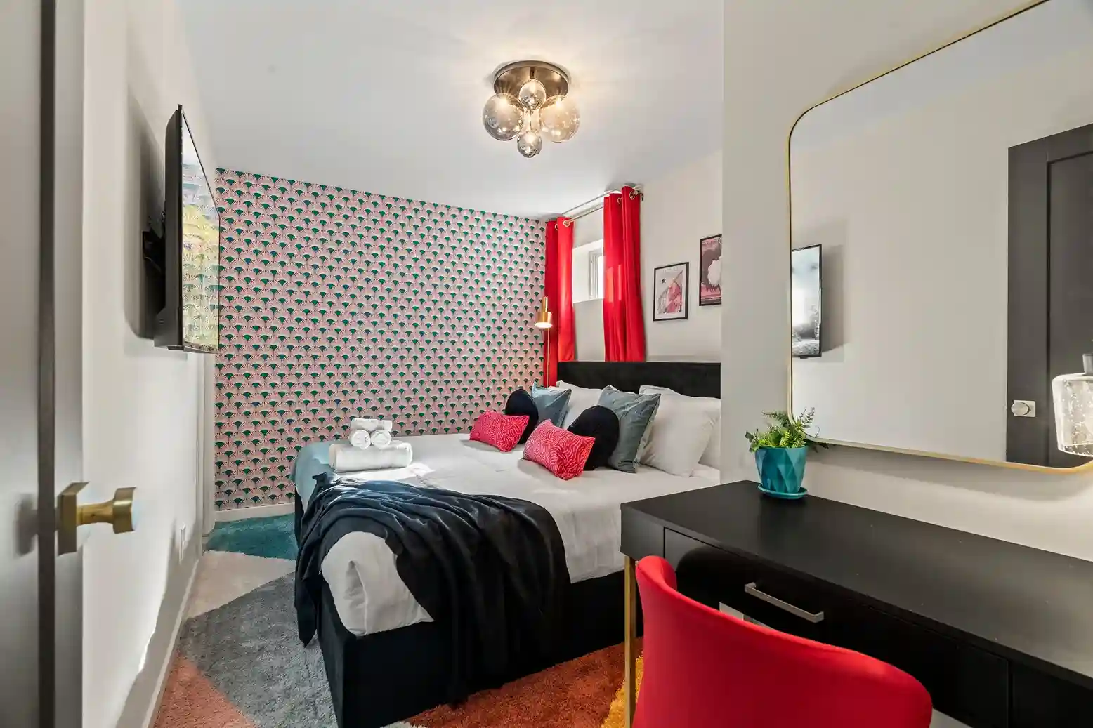 ☆☆ Retreat to two stunning bedrooms designed with bold style and ultimate comfort. The primary bedroom features a KING-size bed with plush bedding, vibrant botanical wallpaper, and a Smart TV - your own private escape after exploring the city. The second bedroom also offers a KING-size bed, chic wallpaper, bold red accents, and another Smart TV. Both rooms ensure a restful stay with premium linens, blackout curtains, and ample storage.