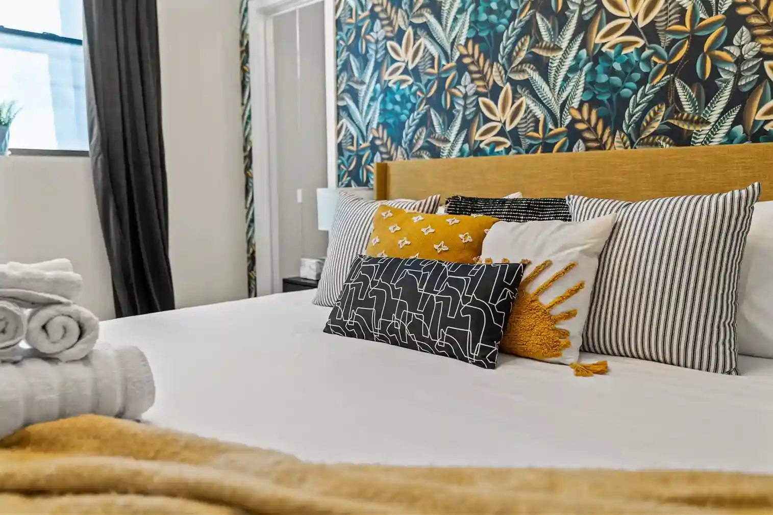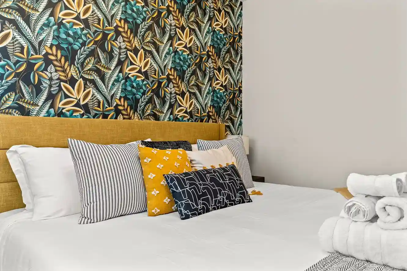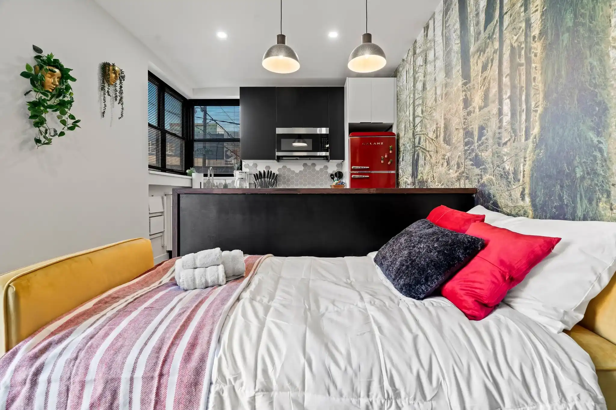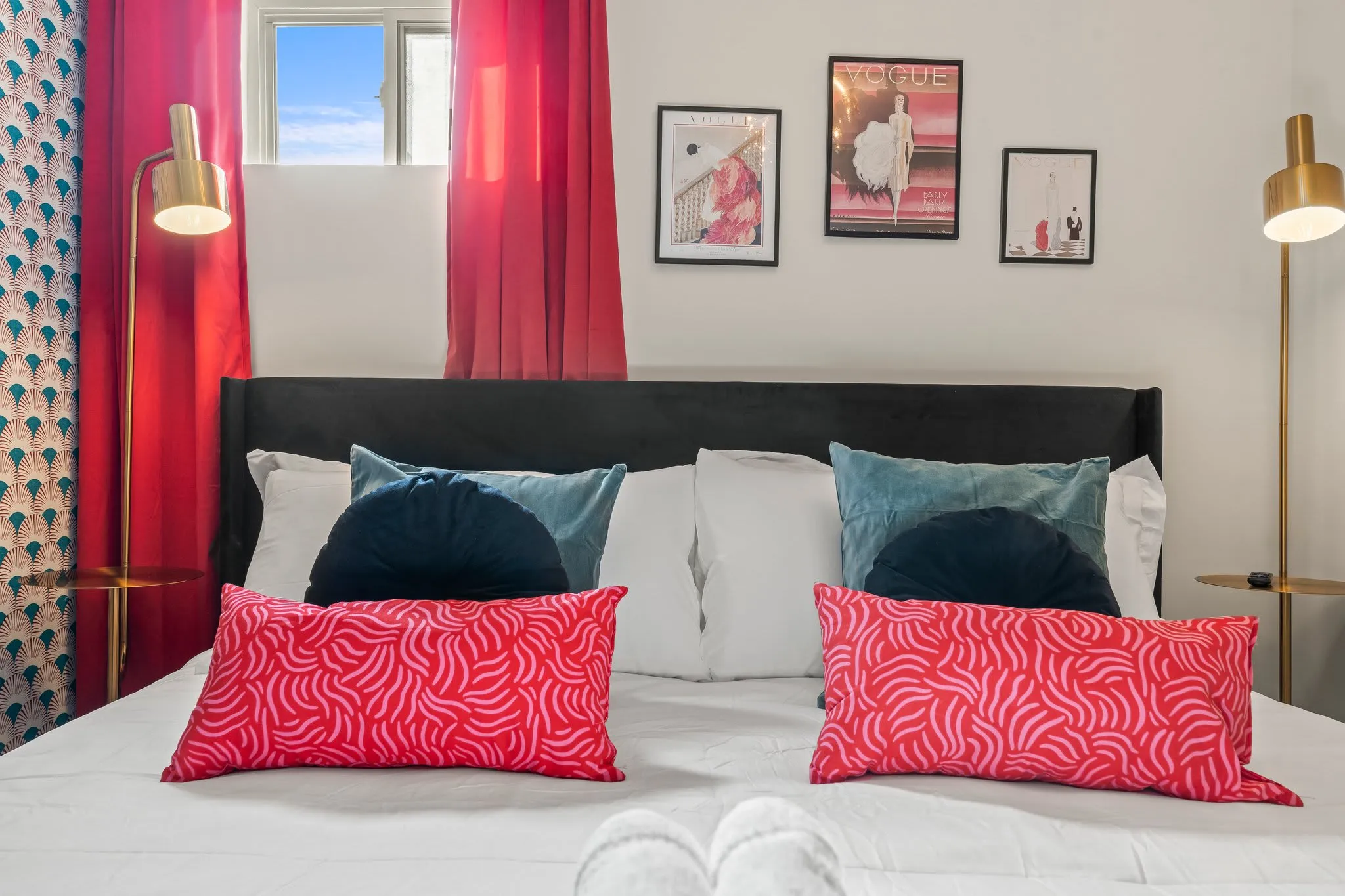 ☆☆ Retreat to two stunning bedrooms designed with bold style and ultimate comfort. The primary bedroom features a KING-size bed with plush bedding, vibrant botanical wallpaper, and a Smart TV - your own private escape after exploring the city. The second bedroom also offers a KING-size bed, chic wallpaper, bold red accents, and another Smart TV. Both rooms ensure a restful stay with premium linens, blackout curtains, and ample storage.