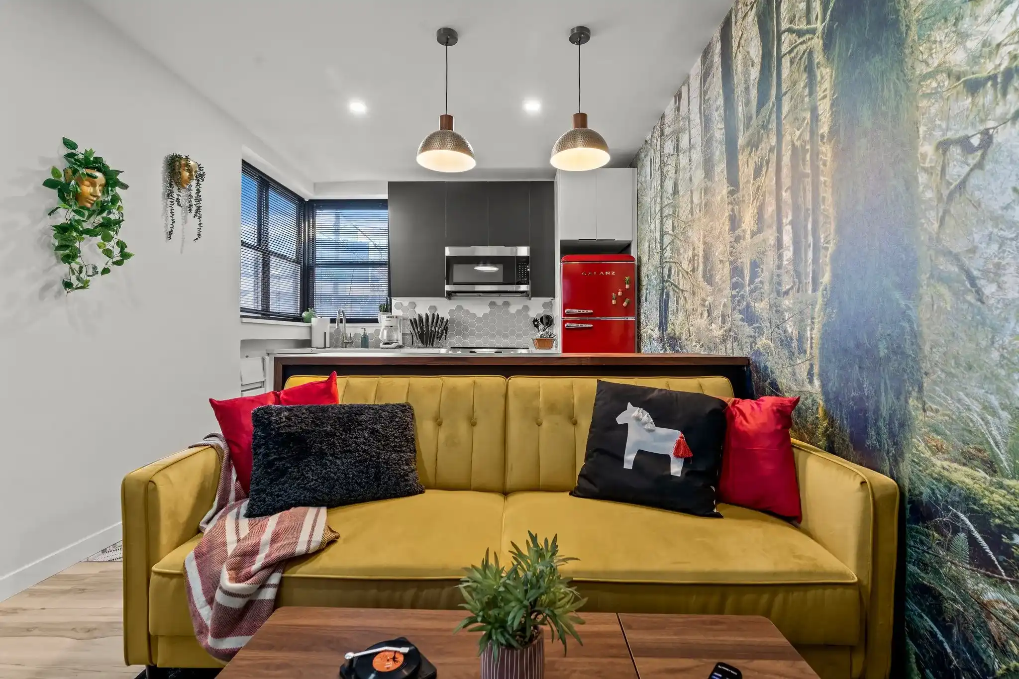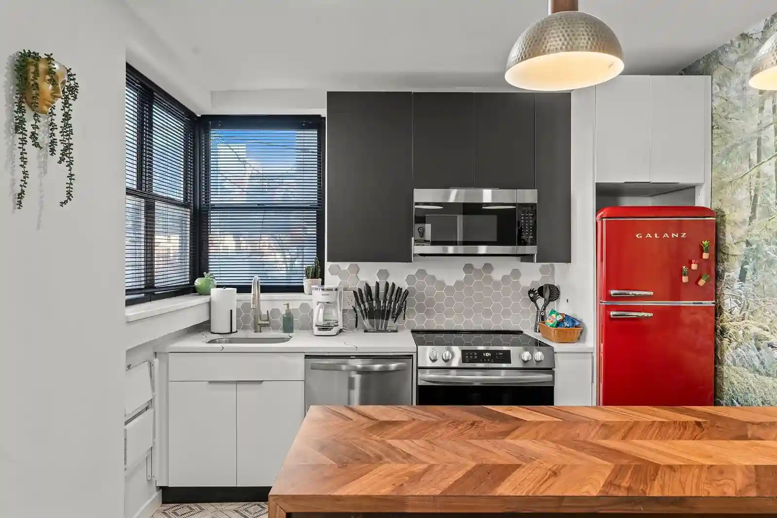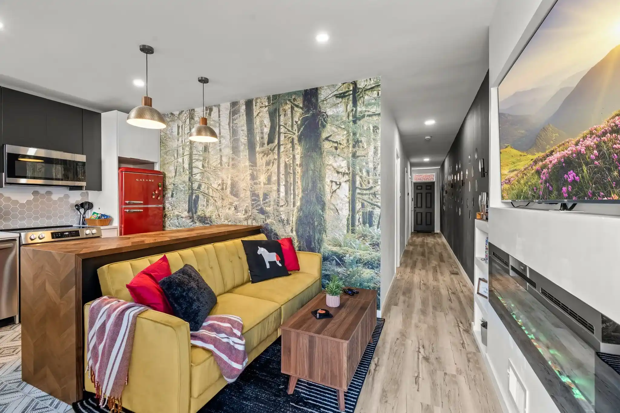 ☆☆ The fully equipped kitchen boasts a stylish hexagon backsplash, sleek cabinetry, and a retro red fridge. Large windows flood the space with natural light, making it perfect for cooking meals or sipping coffee. In the living area, unwind on the mustard sofa, watch your favorite shows on the Smart TV, or relax by the modern fireplace. Board games, books, and a breakfast bar with seating create the perfect blend of comfort and fun.