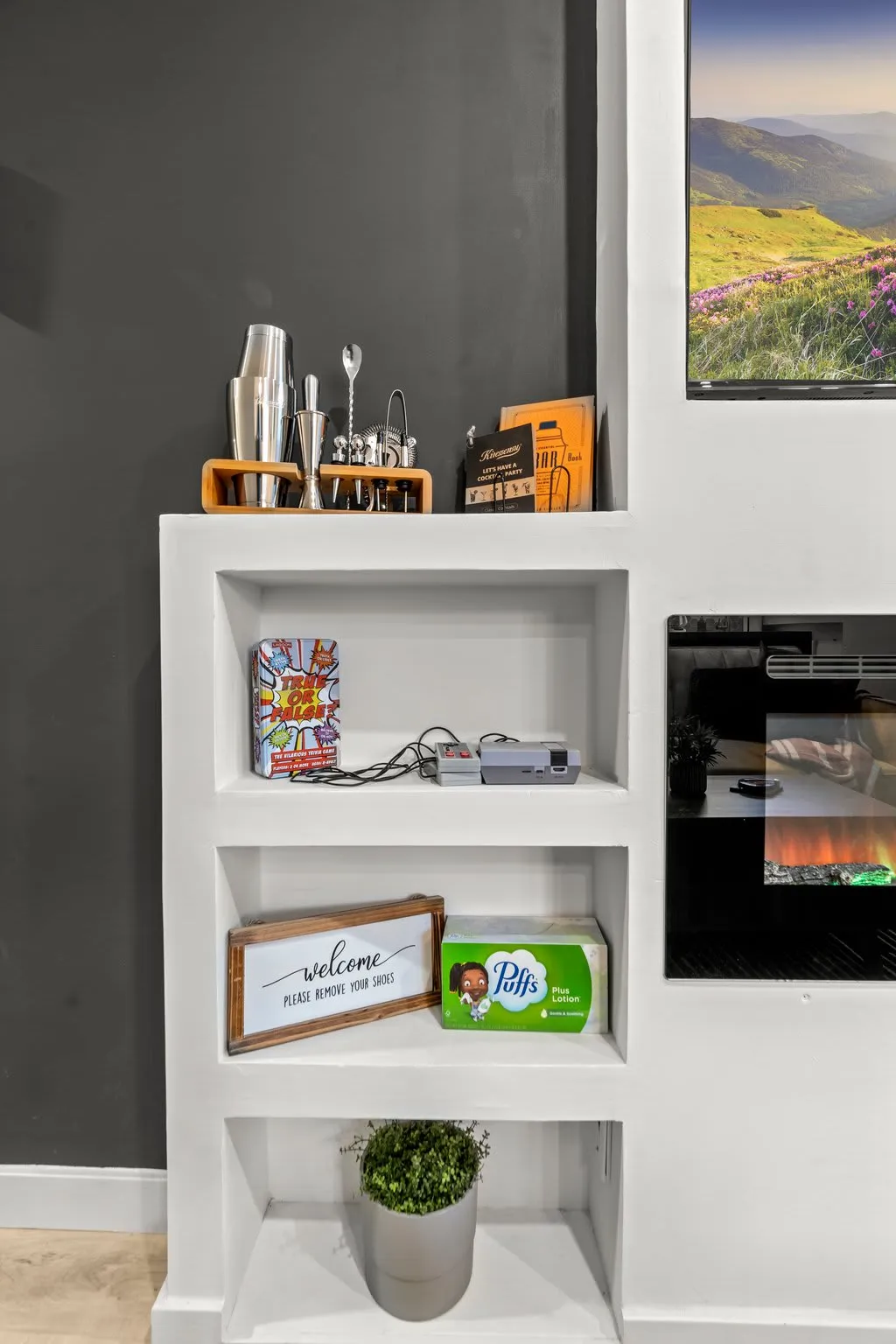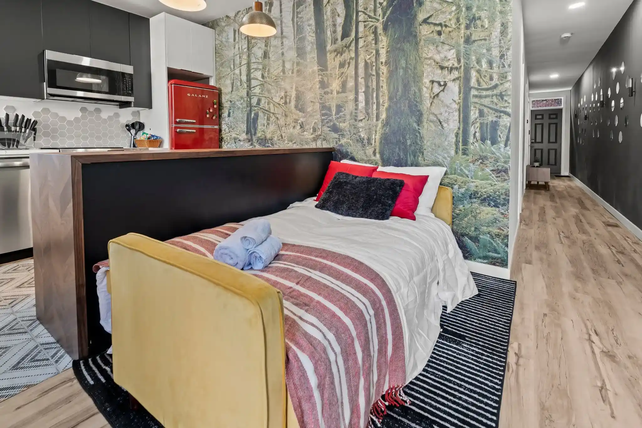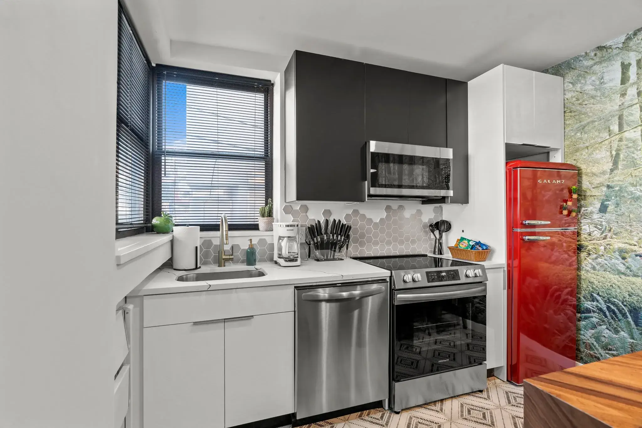 ☆☆ The fully equipped kitchen boasts a stylish hexagon backsplash, sleek cabinetry, and a retro red fridge. Large windows flood the space with natural light, making it perfect for cooking meals or sipping coffee. In the living area, unwind on the mustard sofa, watch your favorite shows on the Smart TV, or relax by the modern fireplace. Board games, books, and a breakfast bar with seating create the perfect blend of comfort and fun.