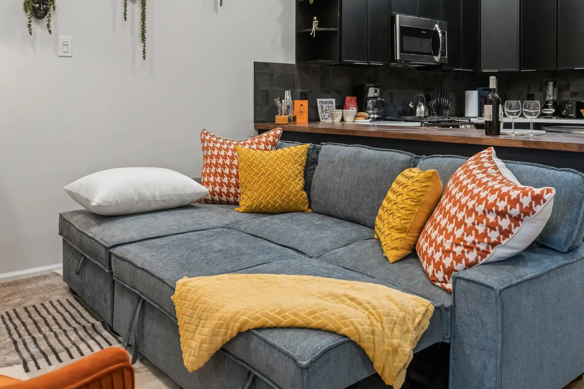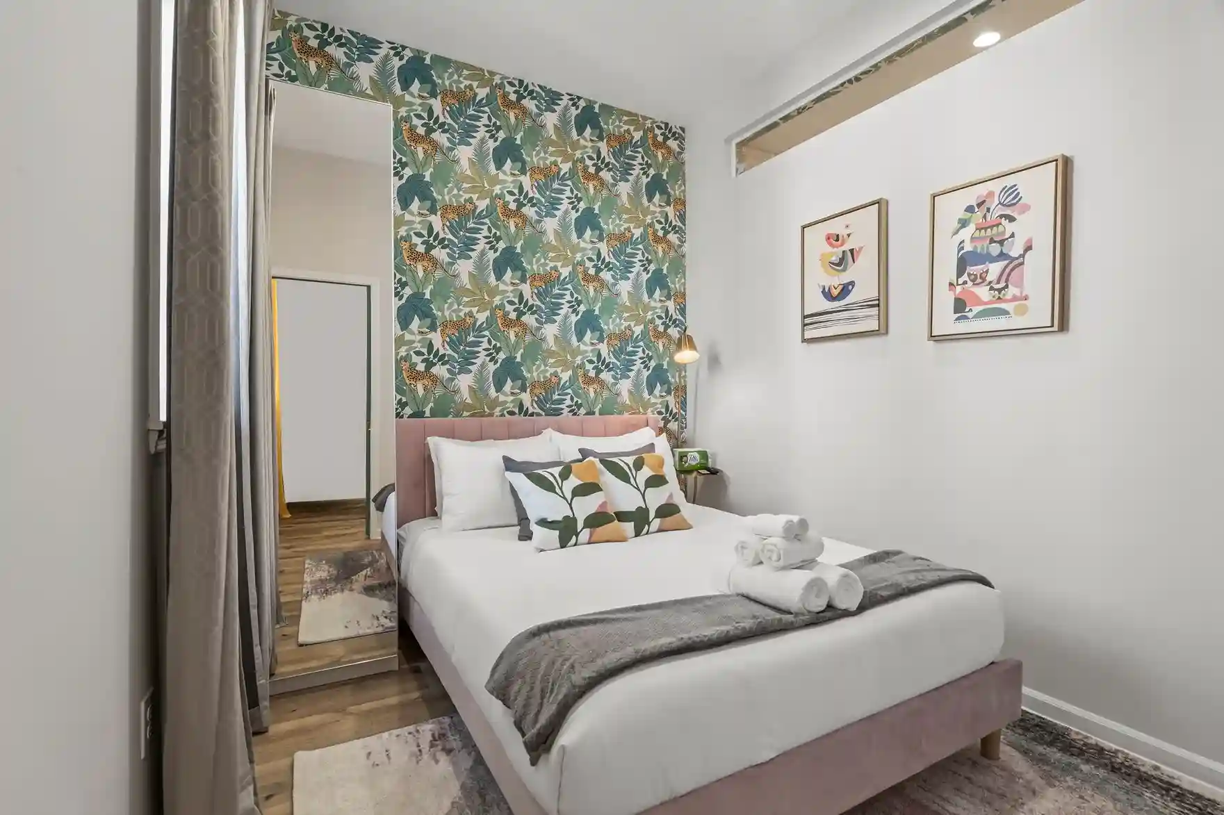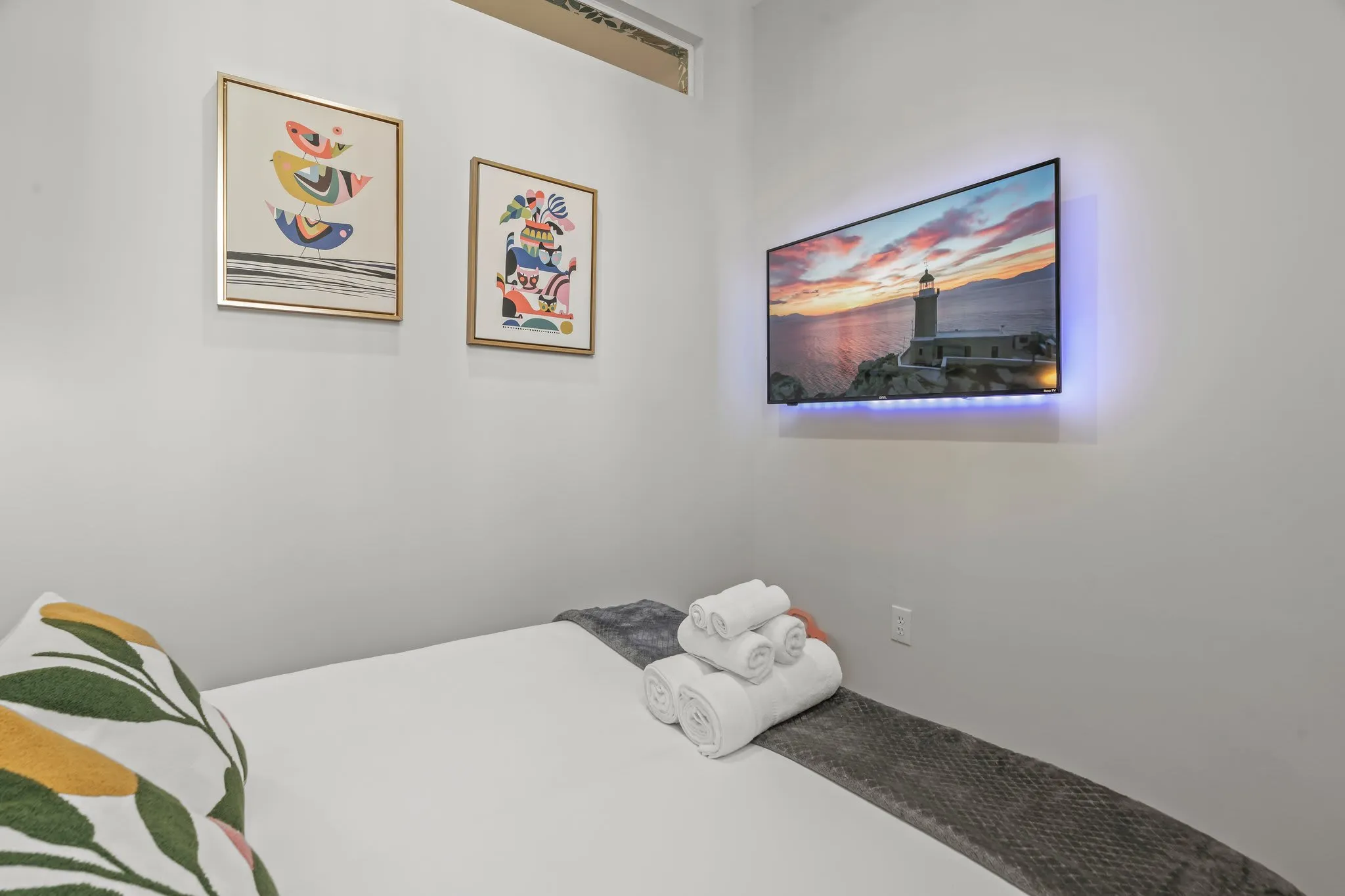 ββ Each bedroom is a stylish sanctuary designed for relaxation and great sleep: Front Bedroom: Queen bed, soft linens, bright, stylish wallpaper. Middle Bedroom: King bed, serene tones, and privacy for restful nights. Rear Bedroom: Two double beds, cheerful décor, and bright natural light. Living Room: Plush sectional sofa folds out for two additional guests. All rooms feature Smart TVs, blackout curtains, and quality linens for your comfort.