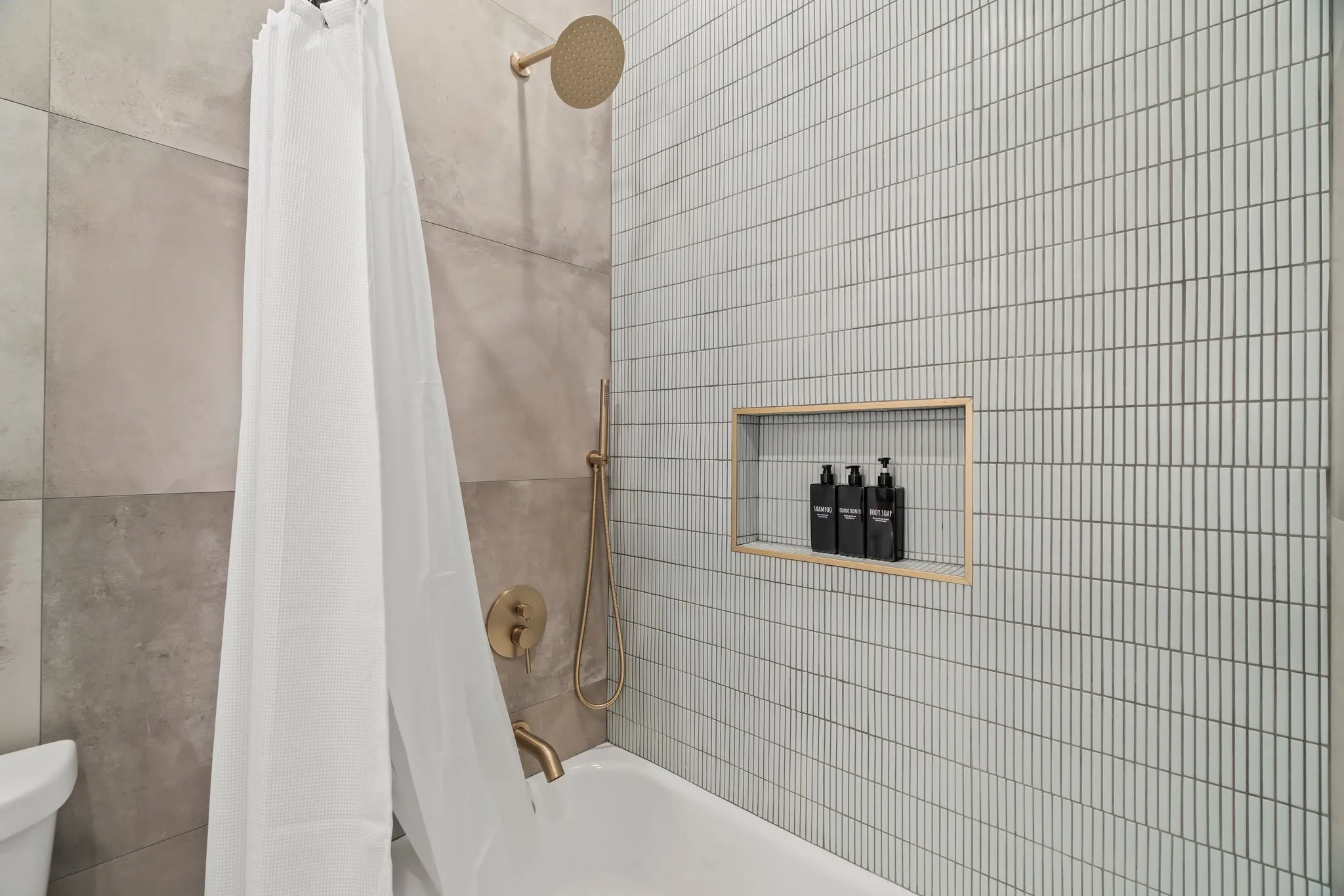 ββ The designer bathroom features a deep soaking tub/shower combo, elegant tilework, and modern fixtures. It’s stocked with shampoo, conditioner, body wash, and plush towels, creating a clean, calming retreat to refresh after exploring the city.