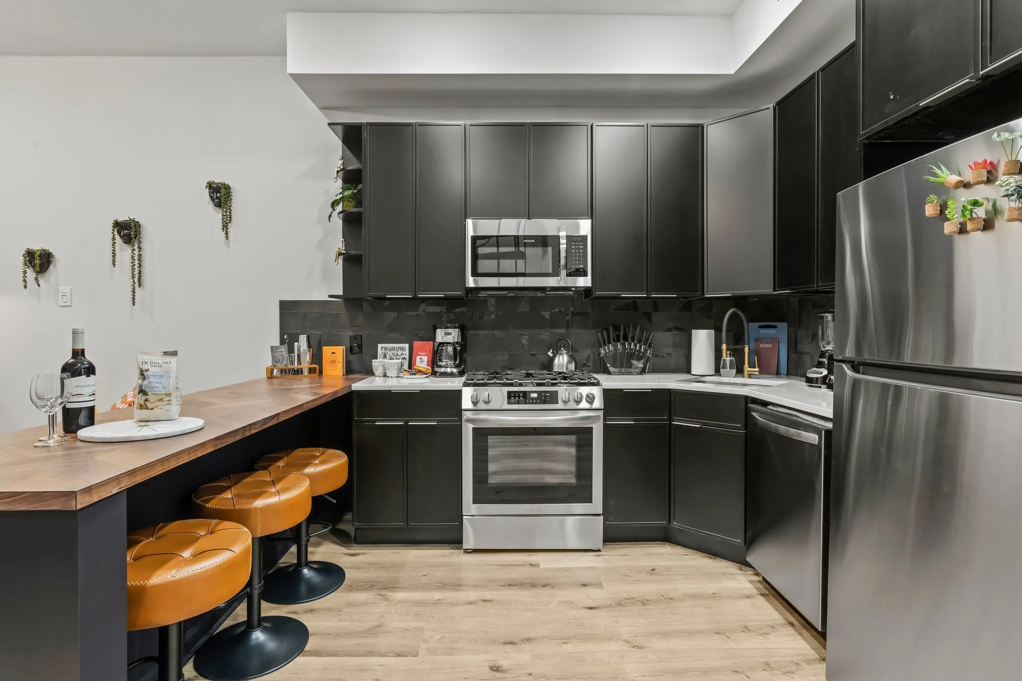 ββ The chef-inspired kitchen includes sleek black cabinetry, stainless steel Frigidaire appliances, and a beautiful walnut island with seating for four. Fully equipped for easy cooking, morning coffee, or family meals. The living area combines comfort and character, featuring a modern sectional, an electric fireplace, and a Smart TV for cozy evenings in. A dedicated desk offers a quiet spot for remote work, and the open layout makes it perfect for gathering and conversation.