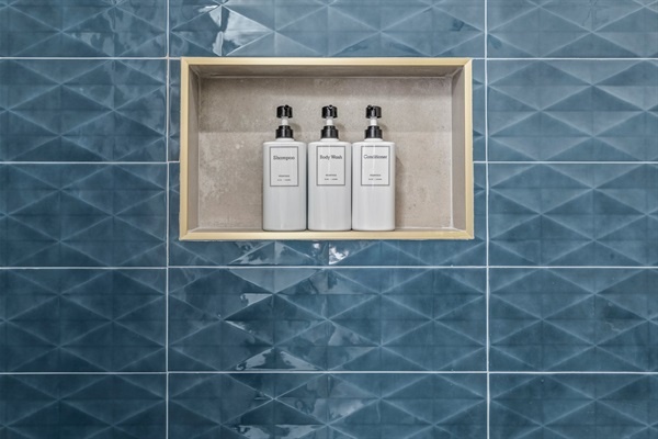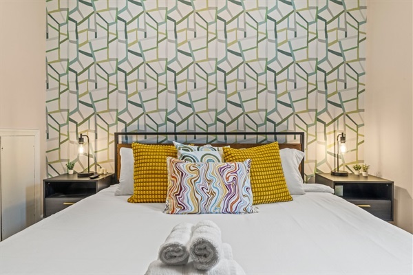 ☆☆ A beautifully designed full bathroom with a deep tub, striking blue designer tile, and gold hardware. Perfect for soaking after a day of sightseeing. You’ll find body wash, shampoo, conditioner, plush towels, cotton swabs, and all the essentials — no need to pack a thing.