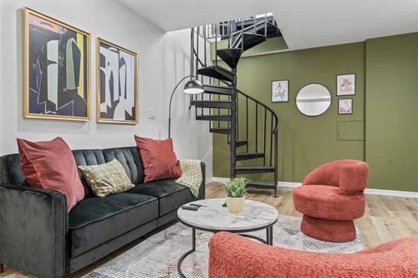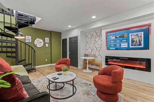 ☆☆ The sleek kitchen is a highlight — complete with stainless steel appliances (stove, dishwasher, fridge, and microwave), cooking essentials, a drip coffee maker with complimentary coffee, and stylish comic-inspired backsplash tiles that add personality and flair. Enjoy meals at the butcher-block breakfast bar with seating for four, or unwind in the cozy living area featuring a Smart TV, modern art, and an electric fireplace that glows warmly at night. A spiral staircase adds a unique architectural touch to the open floor plan, blending comfort and creativity in every corner.