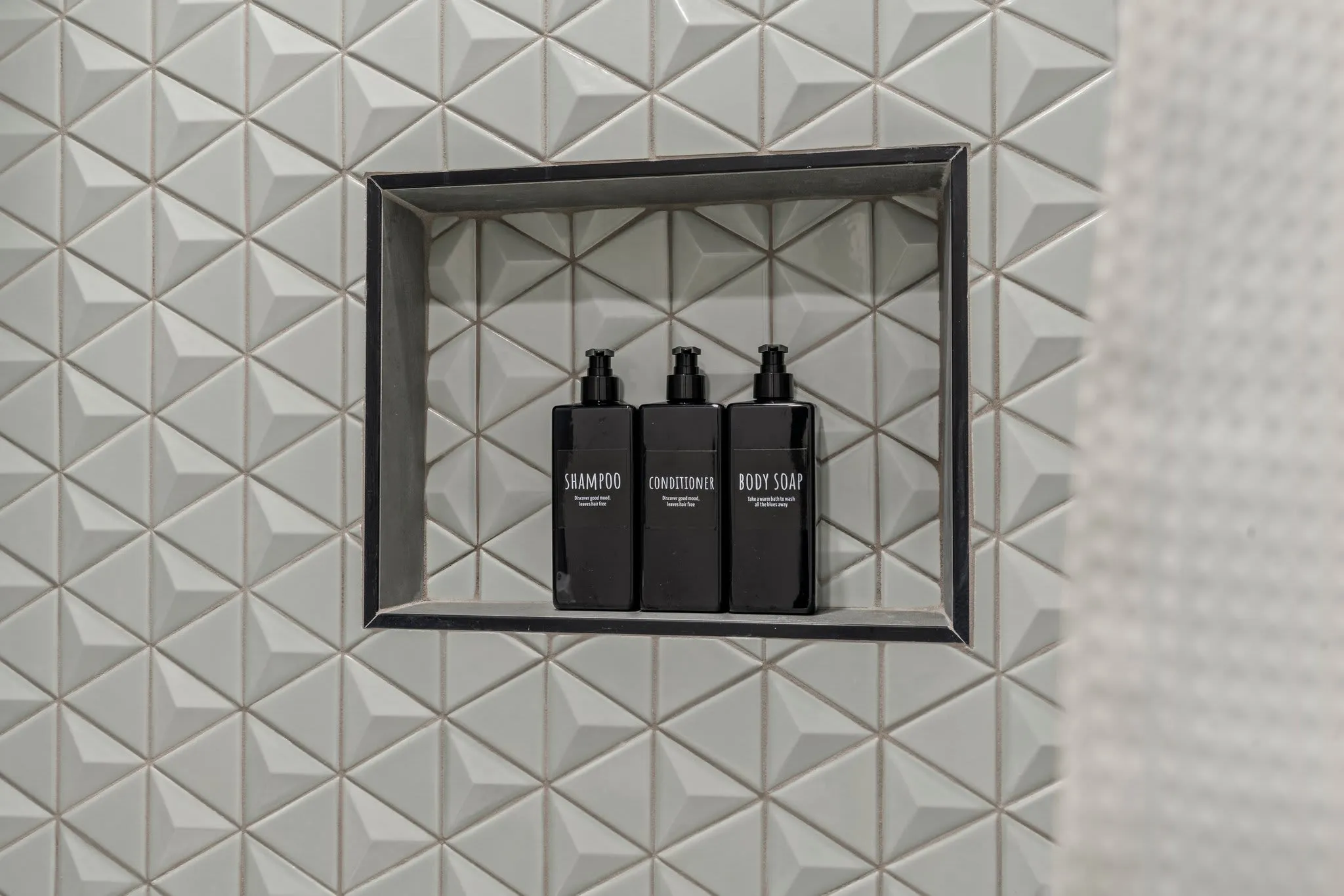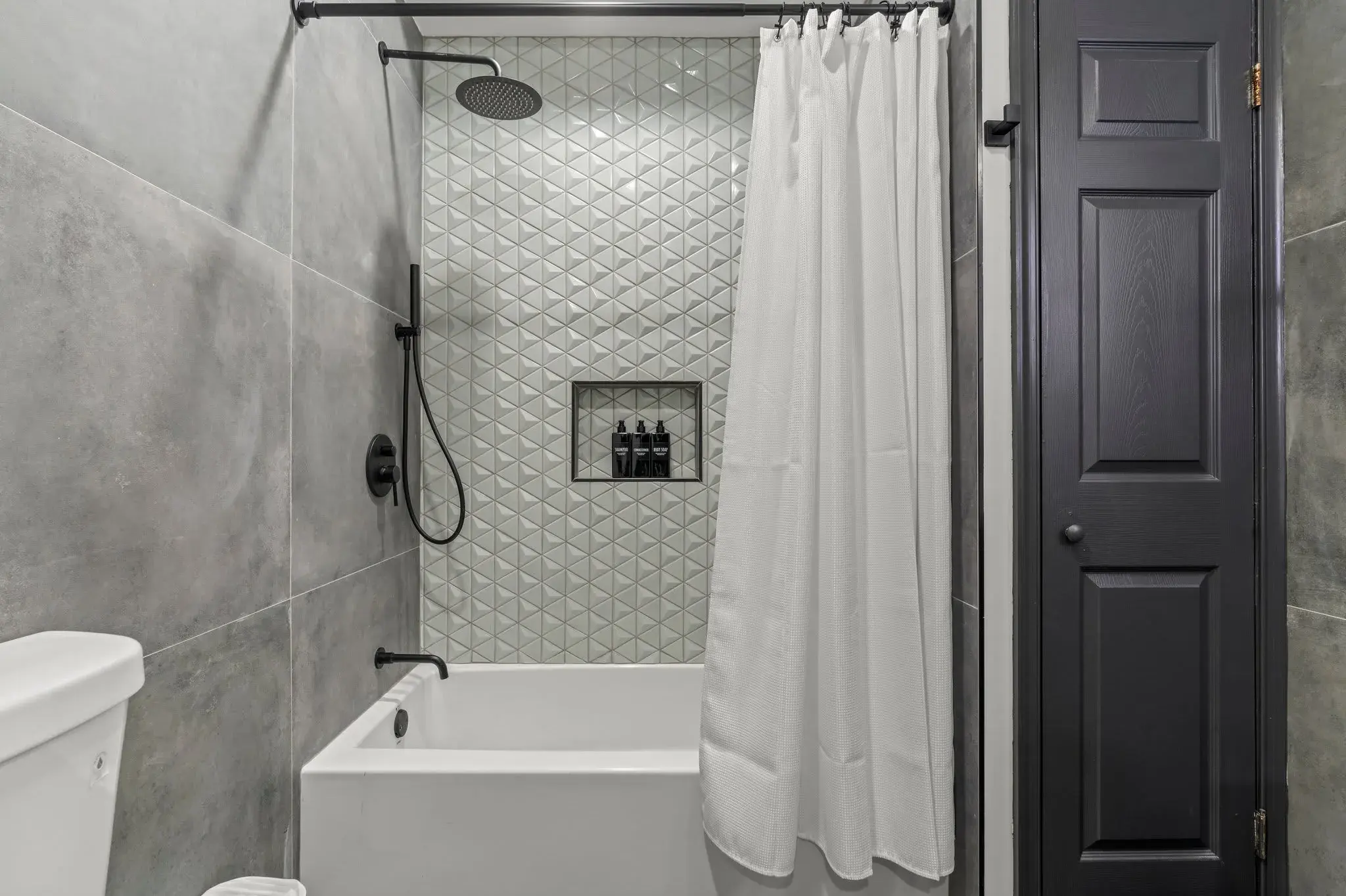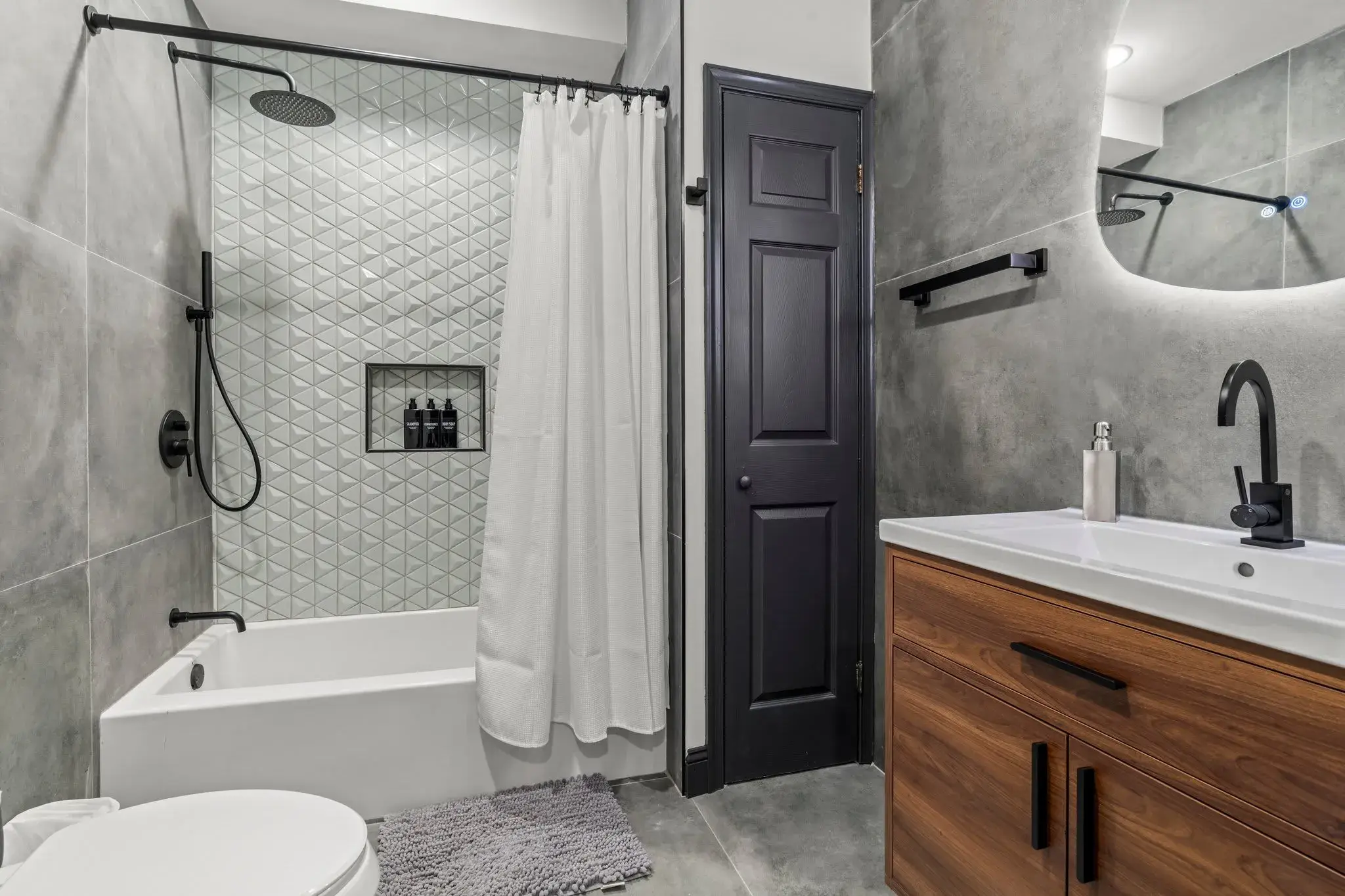 ☆☆ One full bathroom on the main floor offers a tub/shower combo surrounded by designer tile, stocked with premium toiletries and fresh towels. A convenient powder room downstairs provides easy access for guests enjoying the lounge.