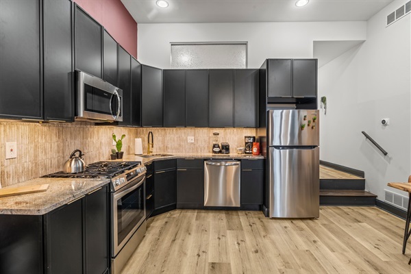The updated kitchen boasts sleek black cabinetry, stainless steel appliances, and hardwood flooring, fully stocked with cookware, dishes, wine glasses, blender, coffee maker, and essentials.