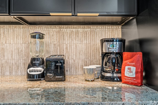 โ Fully Equipped Kitchen – Stainless steel appliances, coffee maker, blender, wine glasses, and all cookware are stocked so you can cook or sip at home with ease. Complimentary coffee, sweetener, and creamer provided.