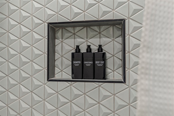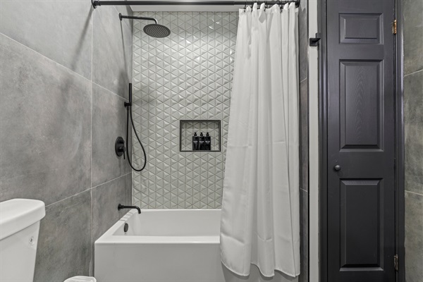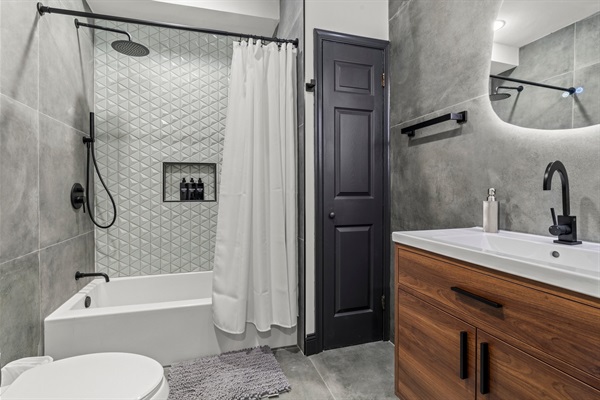One full bathroom on the main floor offers a tub/shower combo surrounded by designer tile, stocked with premium toiletries and fresh towels. A convenient powder room downstairs provides easy access for guests enjoying the lounge.