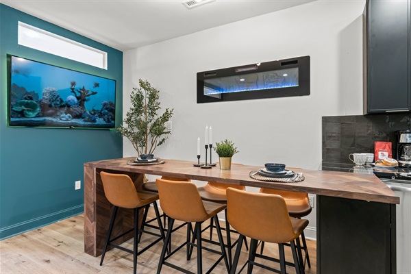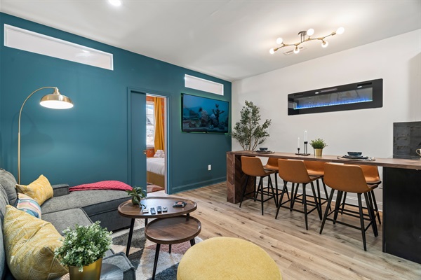 The living area combines comfort and character, featuring a modern sectional, electric fireplace, and Smart TV for cozy evenings in. A dedicated desk offers a quiet spot for remote work, and the open layout makes it perfect for gathering and conversation.