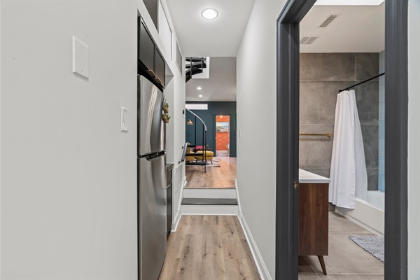 The designer bathroom features a deep soaking tub/shower combo, elegant tilework, and modern fixtures. It’s stocked with shampoo, conditioner, body wash, and plush towels, creating a clean, calming retreat to refresh after exploring the city.