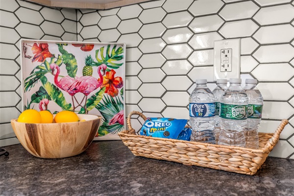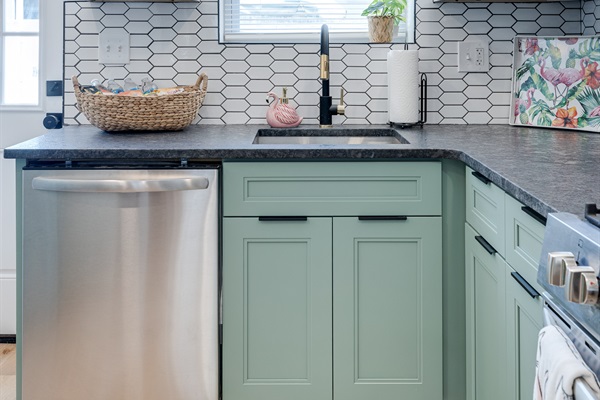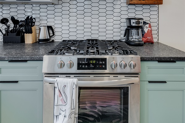 In the kitchen, you’ll find stainless steel appliances, drip coffee maker (coffee, creamer & sweeteners included), blender, cookware, and all essentials.