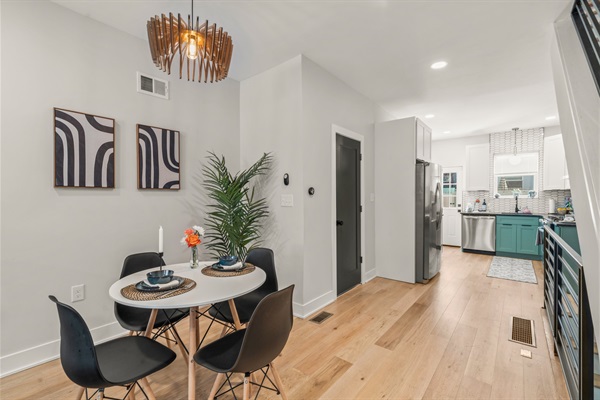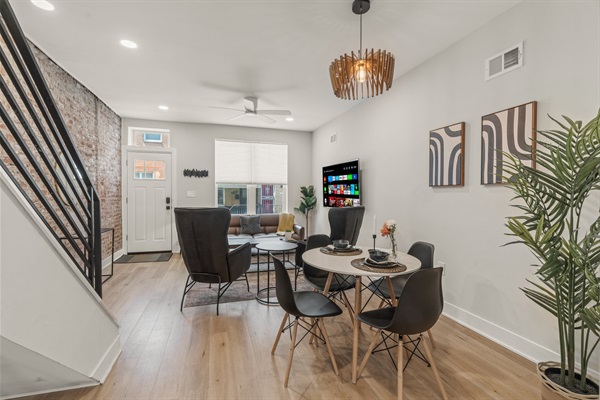 The bright open-concept living room invites you to unwind with exposed brick, modern decor, and a 65" Smart TV. The dining area sits beneath a chic chandelier, creating a perfect gathering space.