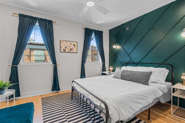 Primary Bedroom (front, 2nd floor): Relax in a plush queen-size bed with luxury linens, wall-mounted Smart TV, stylish accent wall, full closet, and private ensuite featuring rainfall shower and matte black fixtures.
