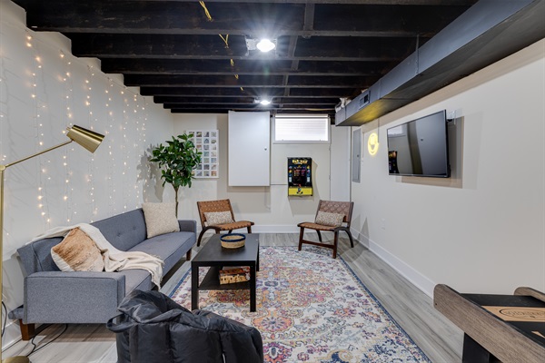 Downstairs, the finished basement game room brings the fun — enjoy Pac-Man, skee ball, board games, and an extra Smart TV for movie nights.