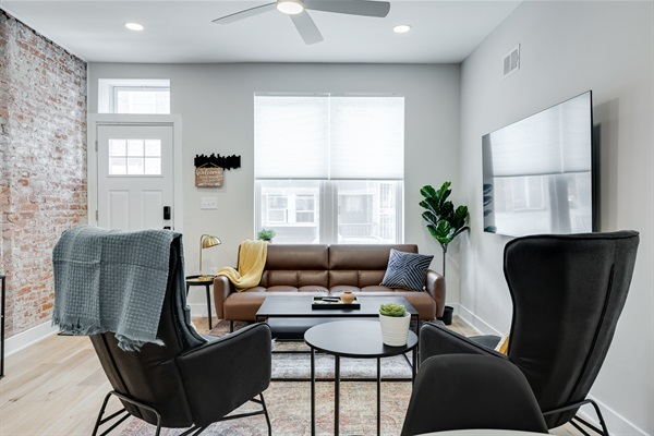 The bright open-concept living room invites you to unwind with exposed brick, modern decor, and a 65" Smart TV.