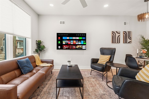 โ Stylish living room with 65” Roku TV, cozy seating & natural light