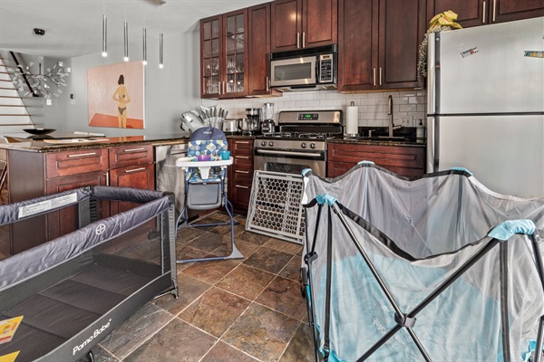β Fully Equipped Kitchen: Stainless steel appliances, cookware, and coffee maker