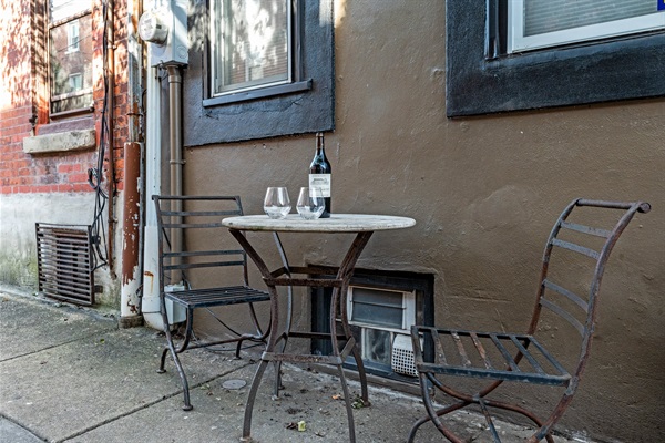 Your private fenced backyard patio is an urban oasis—string lights twinkle above a dining table set for outdoor meals and evening drinks. Enjoy a BBQ, hop on one of the provided bikes, or take a stroll to Penn Treaty Park along the river. Free street parking is available (first come, first served) with paid lots nearby for peace of mind.