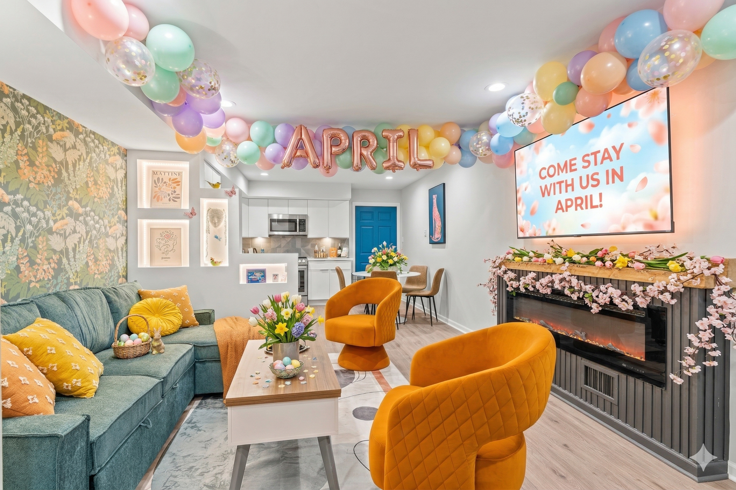 The open-plan design flows effortlessly into the colorful, modern living area, where bold wallpaper and curated art pieces make every corner photo-worthy. Gather around the electric fireplace, challenge each other at the arcade game, or unwind with a movie night on the large smart TV. A dedicated workspace offers privacy for remote work, ensuring productivity blends seamlessly with relaxation.