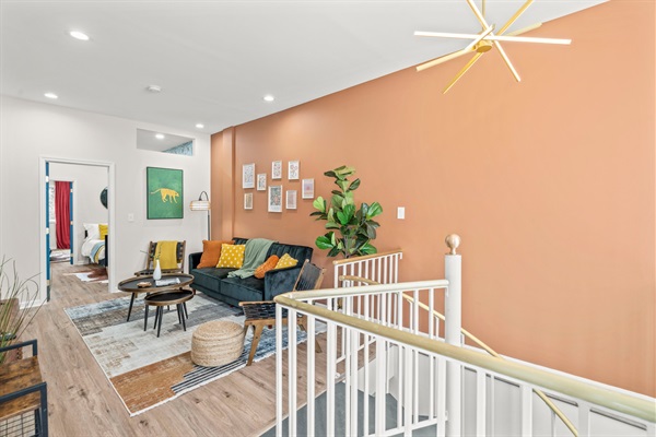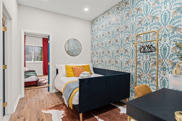 The smart TV offers easy entertainment before bed, and the nearby half bath provides nighttime convenience. Additional sleeping options include a daybed and an air mattress, giving families and small groups flexible, comfortable arrangements. Every guest will find space to relax and recharge in this stylish urban hideaway.
